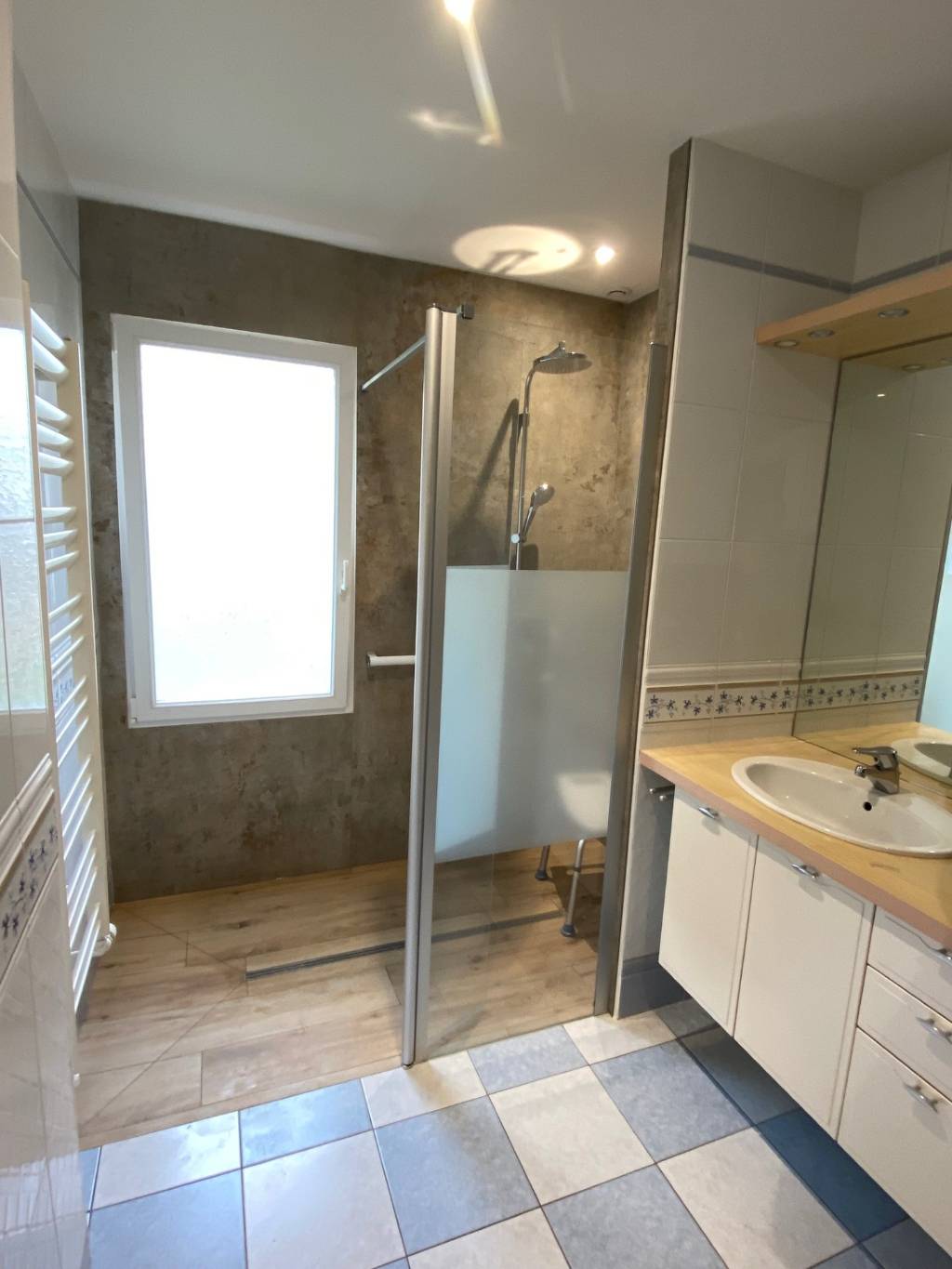 Les clients souhaitaient changer leur receveur par une douche carrelée pour plus d'accessibilité. Ils désiraient également un entretien plus facile et donc des parois sans joints. Ils ne désiraient pas rénover toute leur salle de bains.