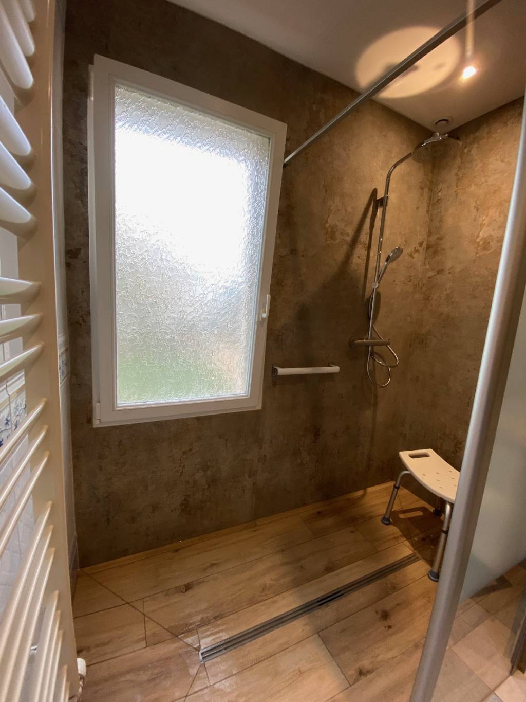 Pour le sol de la douche à l'italienne, un aspect parquet de chez Marazzi (lames de 20x120 cm) a été posé avec un caniveau de chez Schlüter facile à nettoyer. Une étagère en inox brossée a été fixée dans l'angle afin de poser les produits de beauté et très pratique à entretenir. Le ton marroné du carrelage au sol et mural apporte un côté chaleureux à cet espace bains.